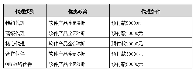 3、代理分為以下級別,代理級別和優(yōu)惠政策以及代理?xiàng)l件見下表: